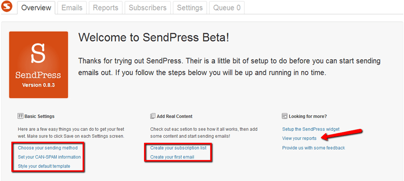 Download SendPresssetup from WordPress repository. Install the downloaded plugin in your website from WordPress dashboard. Go to setting of SendPress and you will get a screen similar to this:It offers you various options highlighted with the red square. You can completely configure your SendPress from this panel.